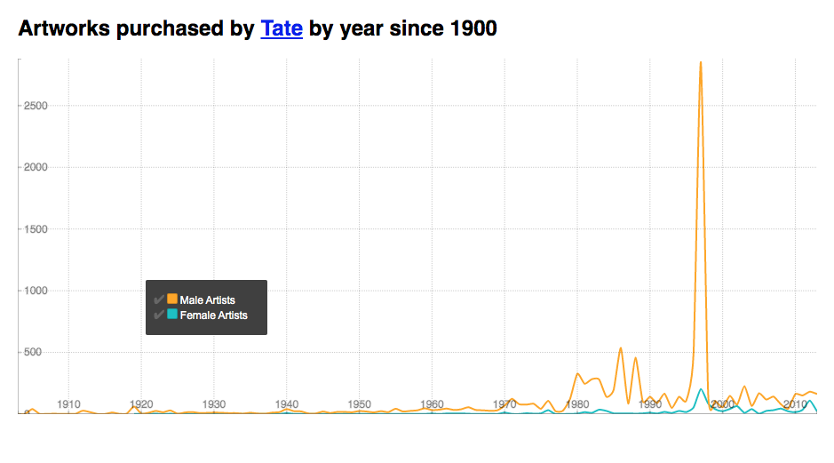 Here is a visualisation created by Zenlan (click link for interractive version) that shows the number of artworks purchased by the Tate since 1900, broken down into gender and arranged on a timeline. It echoes the illustration on the left in terms of gender breakdown (and raises some obvious questions as to the spike of male purchases in 1997), and offers a more modern commentary.