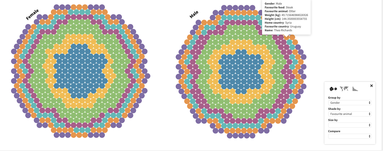 The above visualisation was created using the Survey template that I just mentioned. By selecting ‘gender’ in both the ‘Group by’ and ‘Shade by’ tabs on the control panel, we can look at the gender breakdown based on the year of artists birth in the tate collection for each year (this column was chosen because it was the most complete of the columns in terms of gaps or missing dates). Hovering over a triangle will bring up the accompanying metadata on the artist, and by clicking on the triangle, this metadata will remain visible so that you can navigate to the bottom and copy the artist’s direct url to their page on the Tate Modern website.